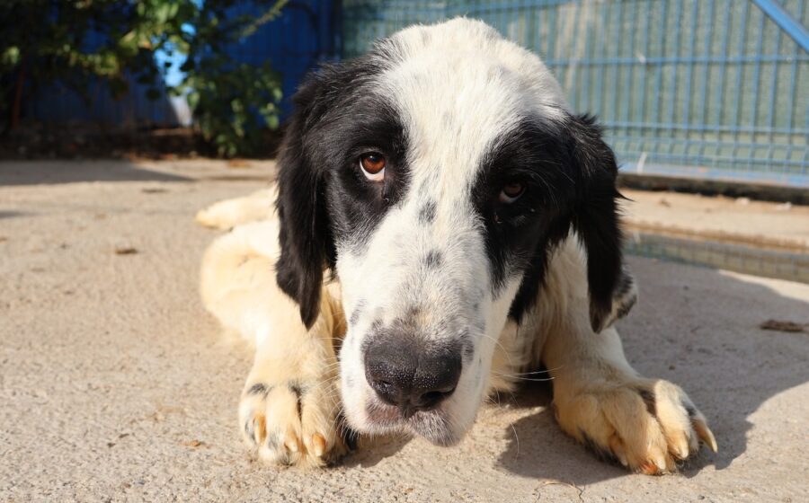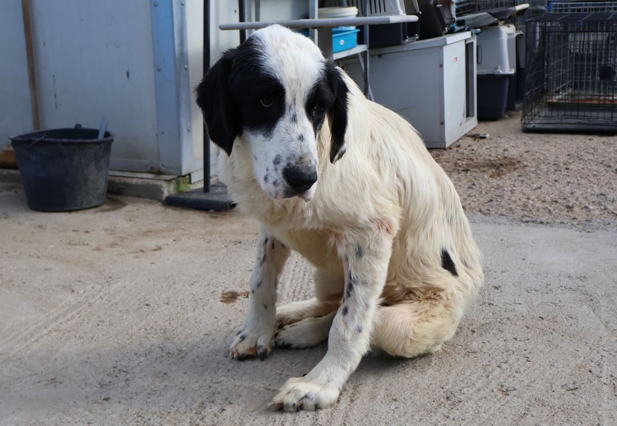 Otis – ein wunderschöner Hund mit sanftem Blick – ist ein großer, stattlicher Rüde mit einer Schulterhöhe von etwa 75 cm. Sein Fell ist überwiegend weiß, durchzogen von schwarzen Akzenten, die ihm einen ganz eigenen, unverwechselbaren Charme verleihen. Seine lackschwarze Nase und die warmbraunen Augen spiegeln zugleich Sanftmut und Stärke wider. Sein Gesicht ist einfach wunderschön – und doch wirkt er, als hätte das Leben ihn schon viel zu früh gezeichnet.