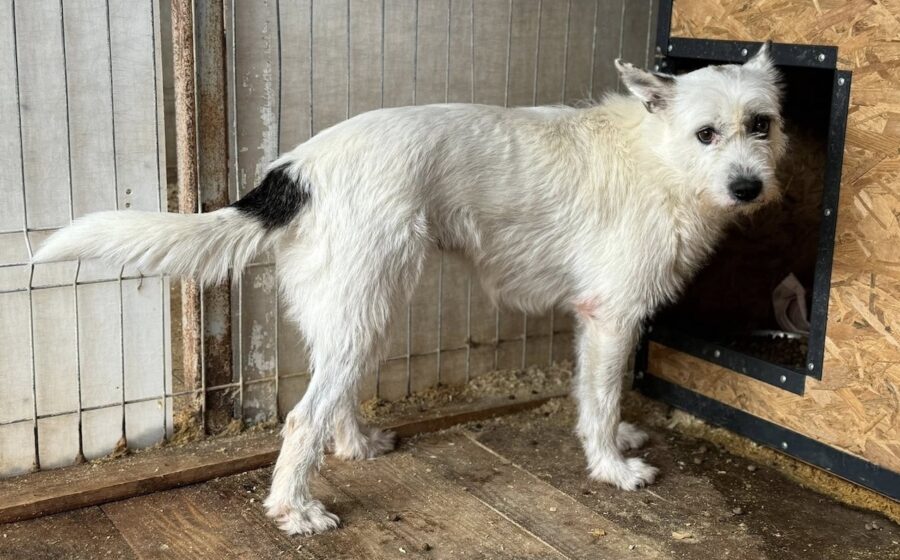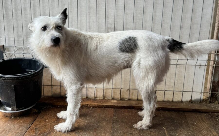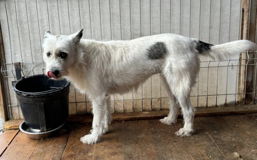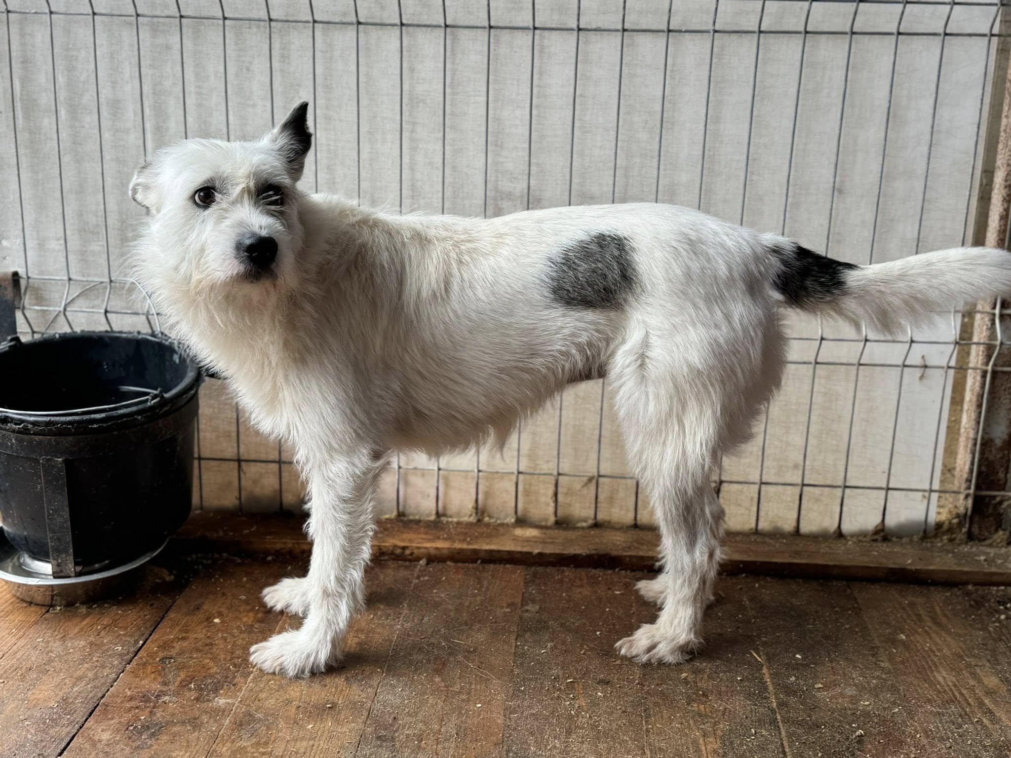 Pauline ist etwa 2 Jahre alt, mittelgroß und hat eine Schulterhöhe von rund 55 cm. Ihr weißes Fell mit schwarzen Akzenten macht sie zu einer echten Erscheinung. Ihre lackschwarze Nase, die dunkelbraunen Augen und ihr wunderschön wildes Gesicht verleihen ihr einen unverwechselbaren Ausdruck. Sie ist schlank gebaut, elegant – eine Hündin, die auf ihre ganz eigene Art beeindruckt, ohne laut zu sein.