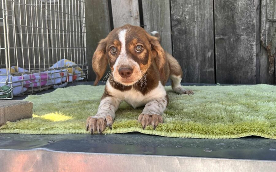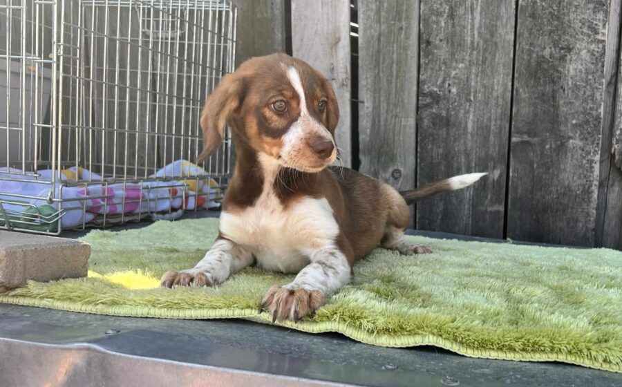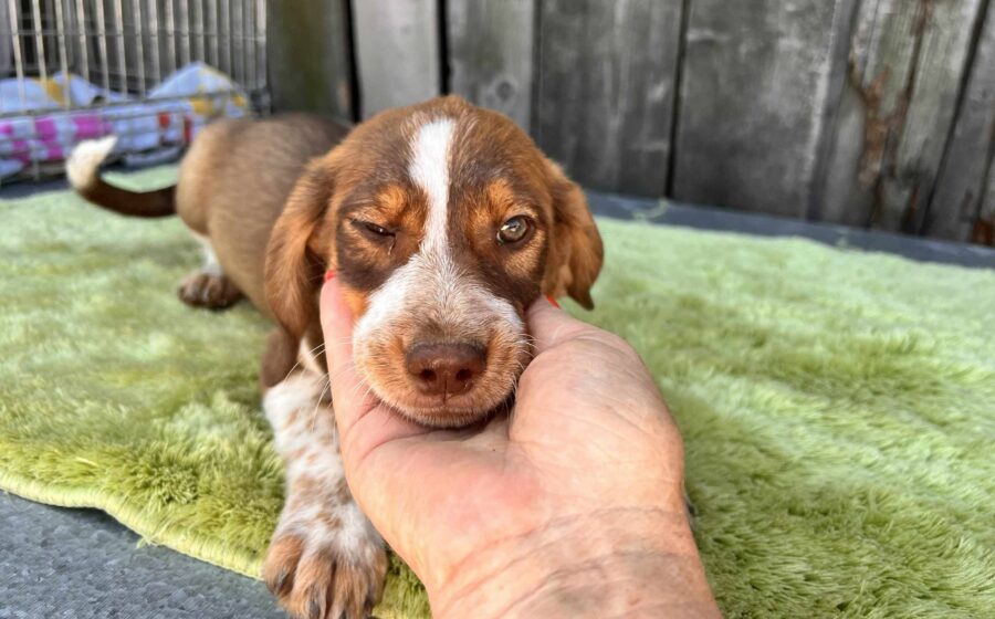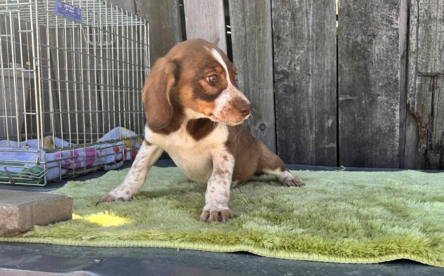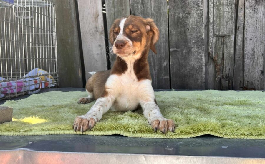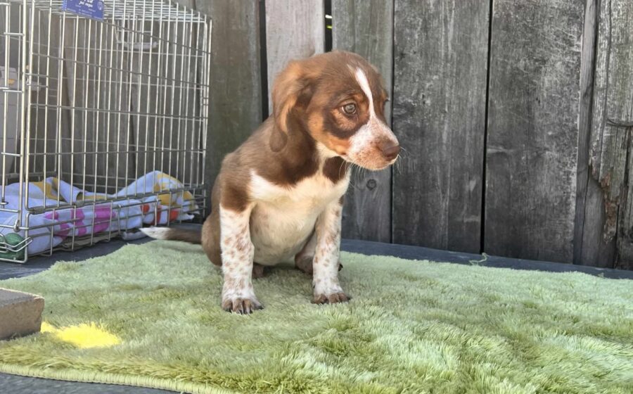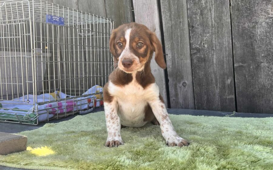 Optisch ist Peps ein kleiner Hingucker: Ihr braun-weißes Fell ist nicht nur flauschig, sondern auch liebevoll getupft – ihre Vorderpfoten zieren süße Sommersprossen, die weiße Brust geht in einen schmalen Streifen auf der Stirn über, und ihre bernsteinfarbenen Augen schauen aufmerksam und klug in die Welt. An der Rute trägt sie ein kleines weißes Fähnchen – perfekt, um alle Herzen im Sturm zu erobern.