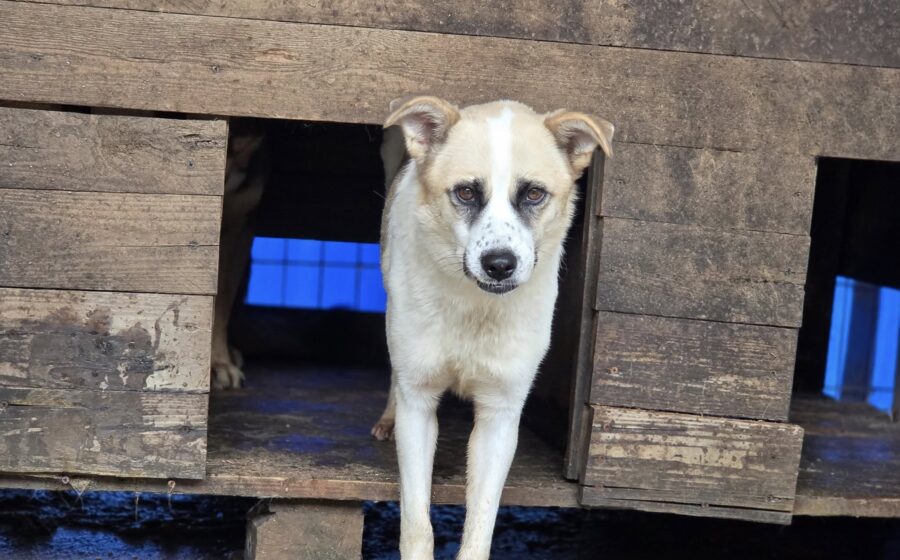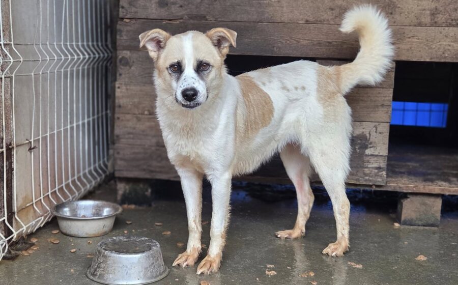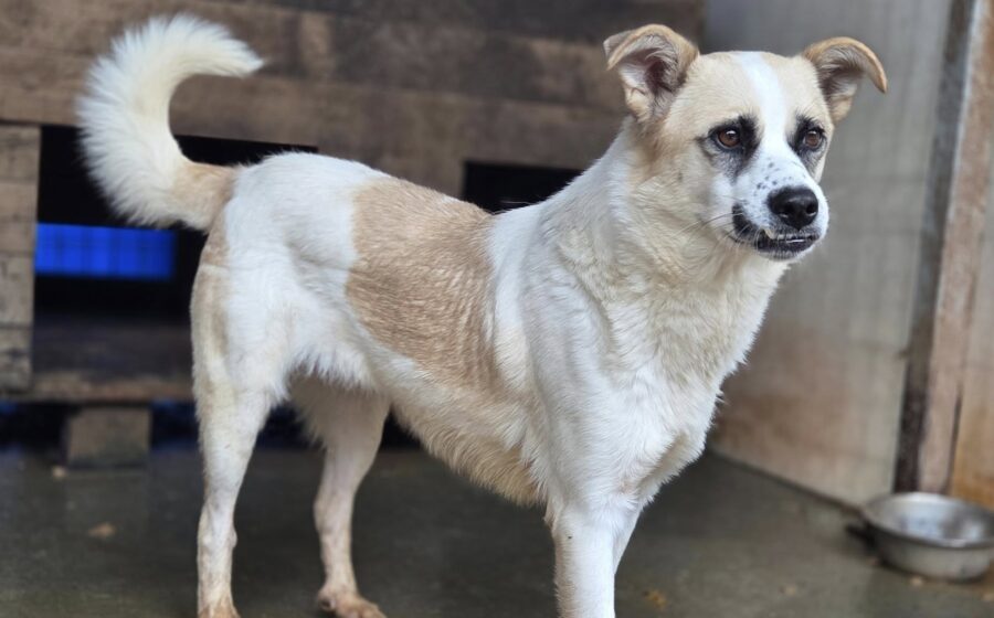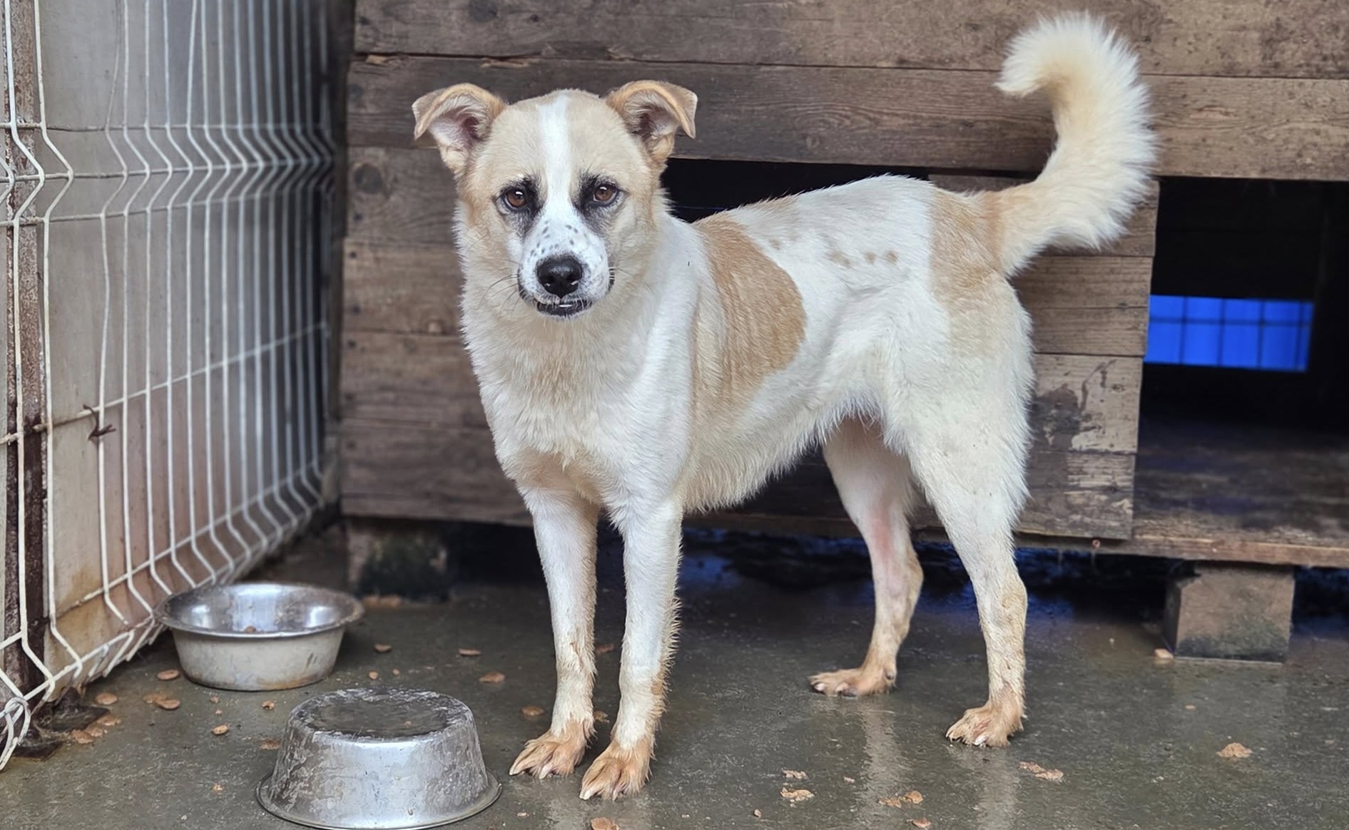 Mit ihren etwa 3,5 Jahren und einer Schulterhöhe von ca. 50 cm ist Perwoll eine mittelgroße Hündin, die mit ihrem strahlend weißen und hellbraunen Fell und der einzigartigen Gesichtszeichnung die Herzen der Menschen im Sturm erobern könnte. Doch hinter dieser Schönheit verbergen sich dunkelbraune Augen, die von einer tiefen Unsicherheit uns Menschen gegenüber erzählen. Doch Perwoll lässt sich davon nicht abhalten. Sie hat bereits tolle Fortschritte gemacht. Mittlerweile kommt sie raus und lässt sich mit Leckerlies füttern, was vor ein paar Wochen noch undenkbar ist. Mit genug Liebe und Geduld sind wir uns sicher, dass sie mit den richtigen Menschen eines Tages auch die Vorzüge schöner Kuscheleinheiten genießen kann. Mit ihren Artgenossen zeigt sich sich verträglich.