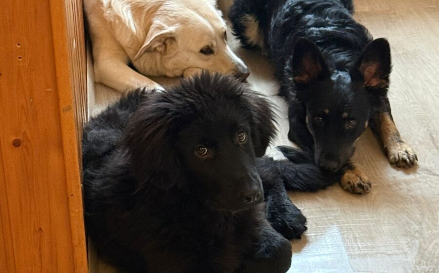 Fröhlich und neugierig tobt Ping mit den beiden Hündinnen auf der Pflegestelle durch den Tag. Auf Sitz hört er schon, an der Leine laufen funktioniert auch schon sehr gut und ab und zu meldet er sich schon, wenn er mal raus muss.