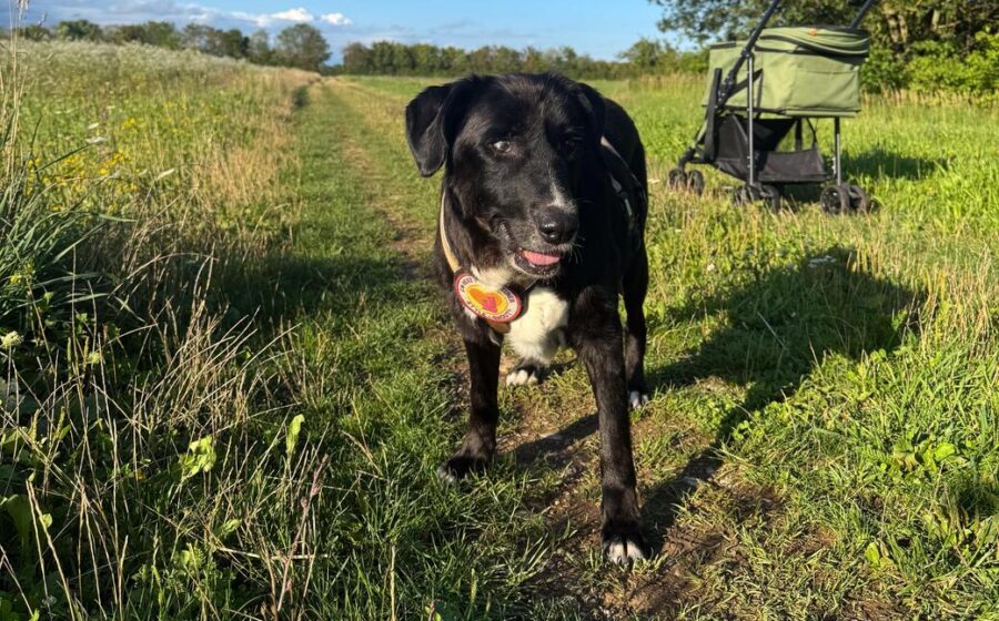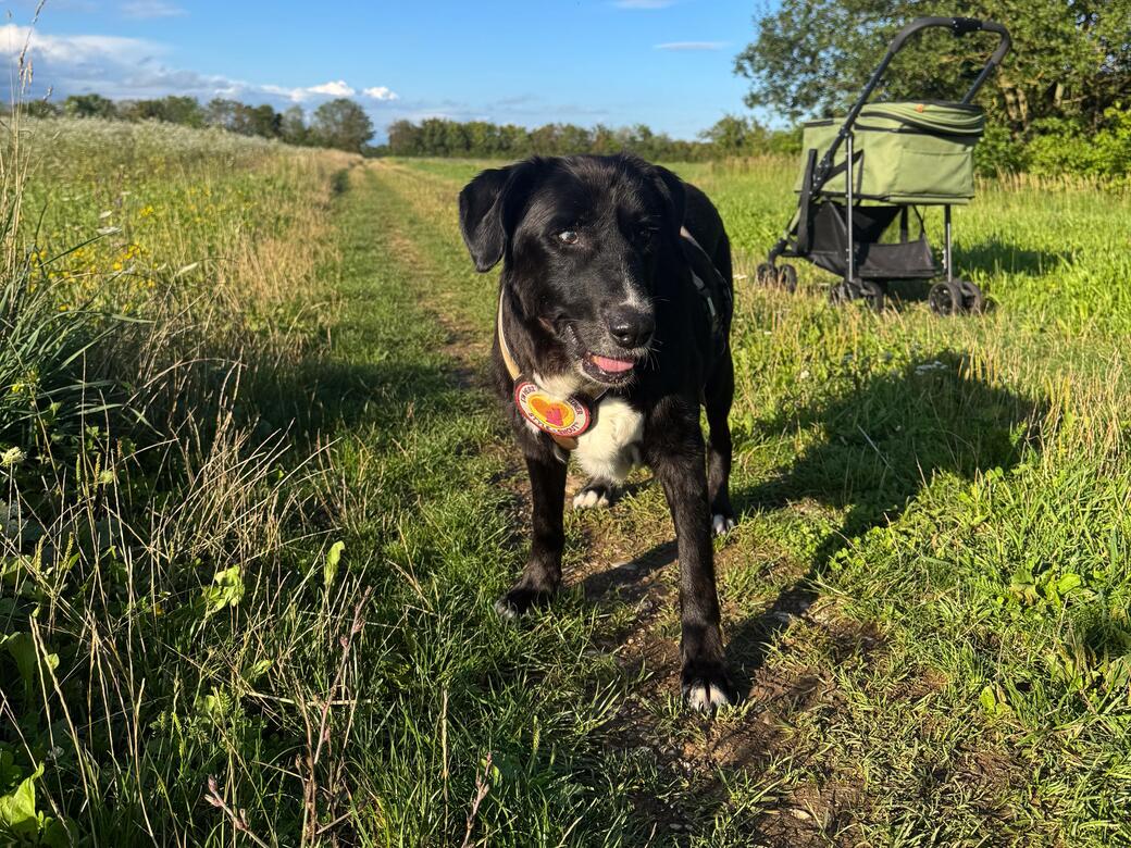 Der Mischlingsrüde, mit seinem schönen dunkelbraunen Fell und der leicht ergrauten Schnauze, misst 55 cm und wiegt 20 kg. Er leidet an Arthrose und Spondylose – beides typische, altersbedingte Veränderungen des Bewegungsapparates. Das hindert ihn jedoch nicht daran, zukünftig noch gemächlich seine Runden zu drehen. In seiner Pflegestelle haben seine Pflegeeltern immer einen Hundewagen dabei, falls er sich auf den etwas längeren Runden zwischenzeitlich mal ausruhen möchte.