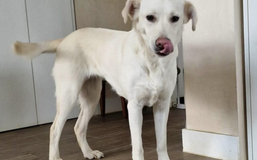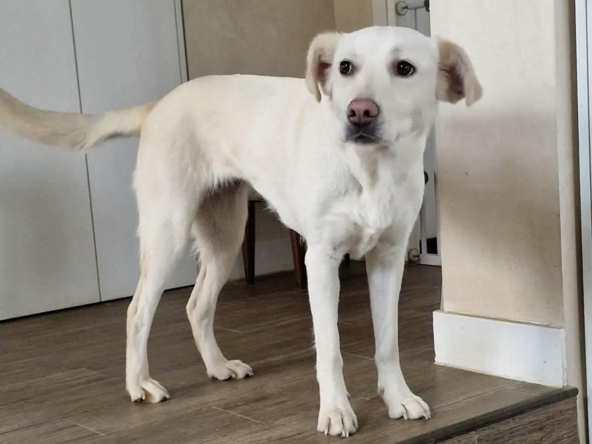 Polaris ist eine etwa 1 Jahr junge, mittelgroße Hündin mit einer Schulterhöhe von ca. 55 cm und einem Gewicht von rund 20 kg. Ihr weißes Fell unterstreicht ihre schlanke, elegante Statur. Die braunen Augen blicken offen und neugierig in die Welt, ihre zarte rosa Nase und das wunderschöne Gesicht mit den großen Schlappohren machen sie zu einer echten Erscheinung.