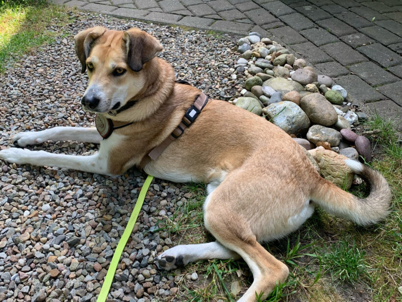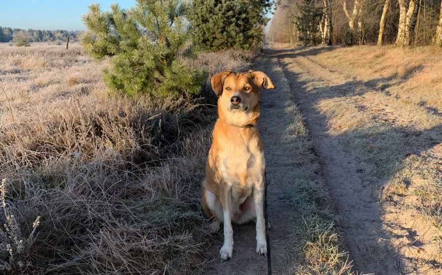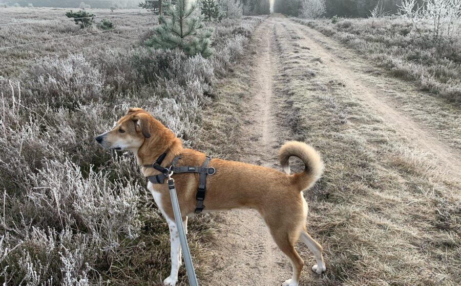 Ein weiteres Thema ist ihr Jagdtrieb, der zwar schon besser geworden ist, aber noch vorhanden ist. Auf ein klares „Nein“ reagiert sie inzwischen häufiger – dennoch ist sie nicht für ein Zuhause mit Katzen geeignet, such wenn sie aktuell mit einer Katze zusammenlebt. Motorräder und Autos mit Anhängern lösen bei ihr ebenfalls starkes Verhalten an der Leine aus – hier braucht es viel Management, Training und Geduld. Einen Maulkorb ist Polly bereits gewöhnt.