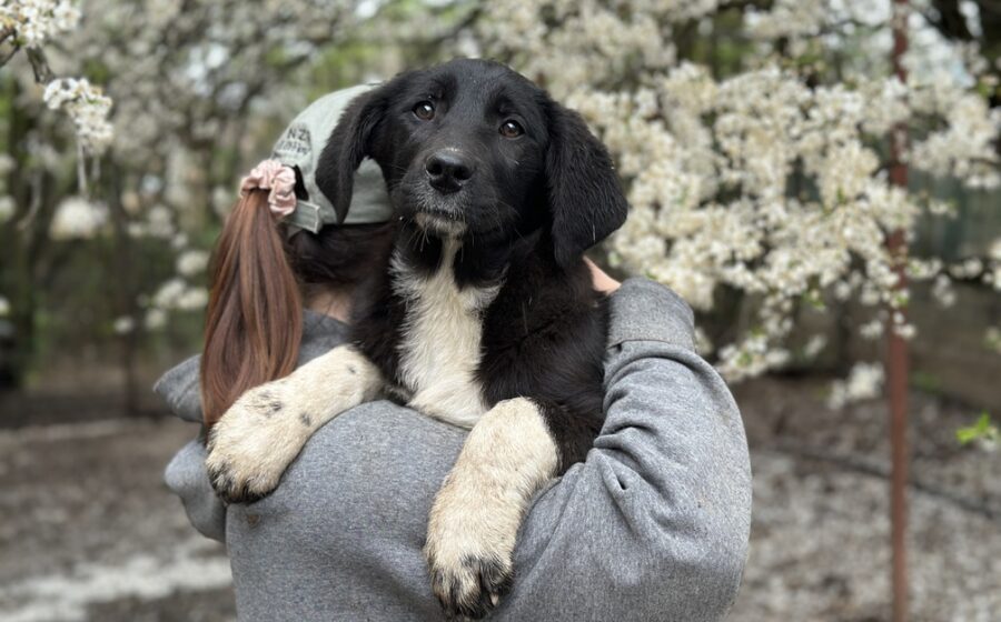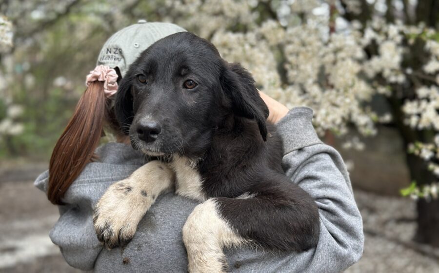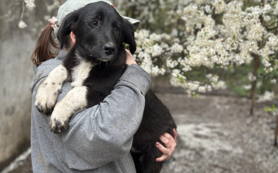 Die etwa 5 Monate alte Hündin wird ausgewachsen vermutlich mittelgroß sein. Ihr schwarzes Fell wird durch zwei lange weiße Vorderpfoten mit kleinen schwarzen Punkten und eine weiße Brust wunderschön ergänzt – ein echter kleiner Hingucker.