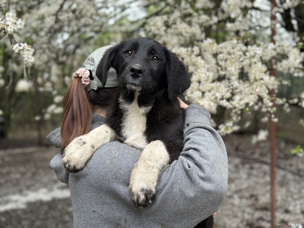 Die etwa 5 Monate alte Hündin wird ausgewachsen vermutlich mittelgroß sein. Ihr schwarzes Fell wird durch zwei lange weiße Vorderpfoten mit kleinen schwarzen Punkten und eine weiße Brust wunderschön ergänzt – ein echter kleiner Hingucker.