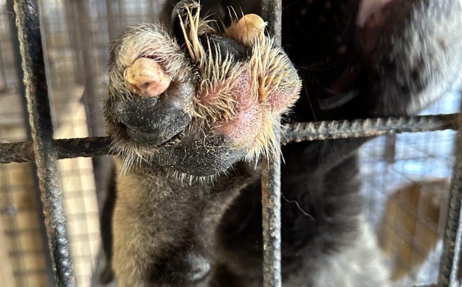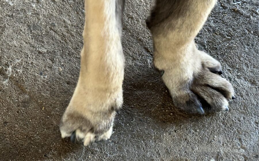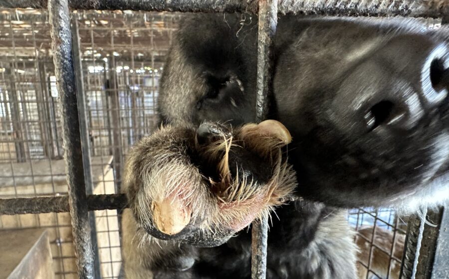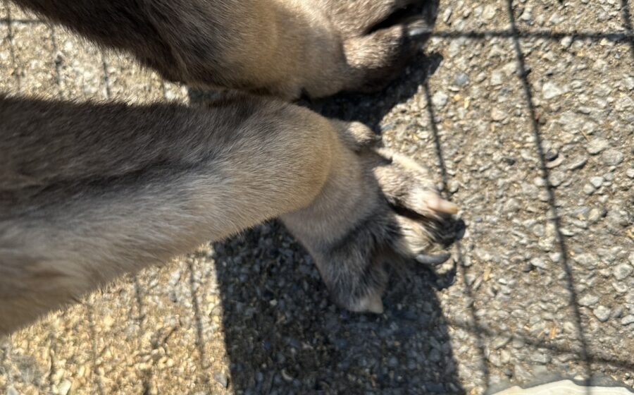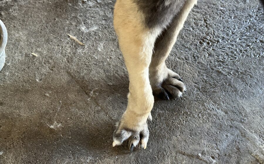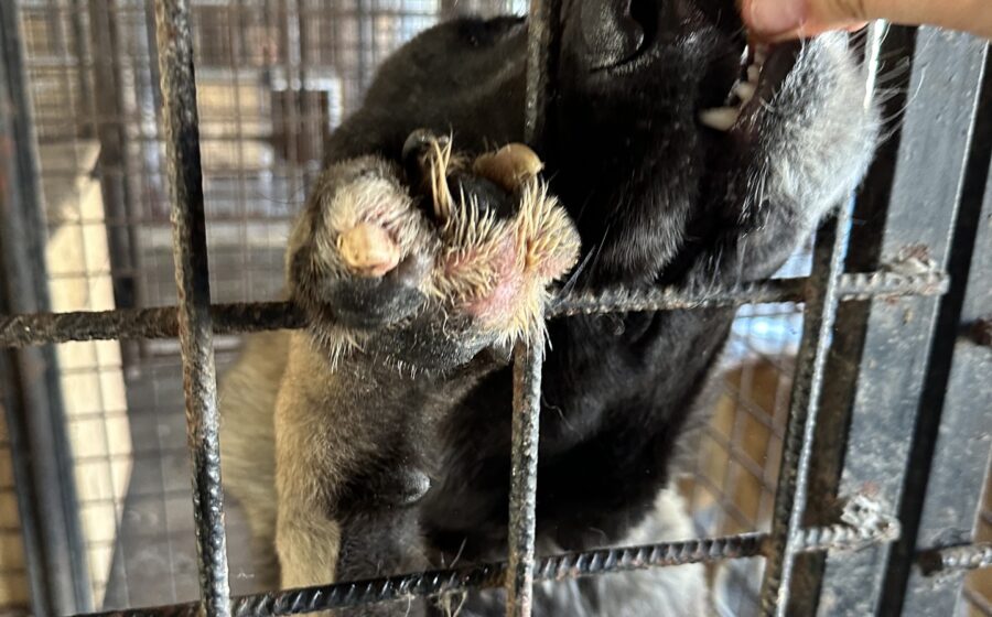 Sangas linkes, bernsteinfarbenes Auge sticht sofort aus seiner dunklen Maske heraus. Sein rechtes Auge ist leider nicht mehr vorhanden. Es sieht so aus, als sei Sanga nur mit drei Klauen geboren worden. Beim Laufen scheint es ihn nicht zu stören. Die Tierärzte sagen, dass die Pfote so angeboren ist. Diese wird aktuell noch in Deutschland untersucht.