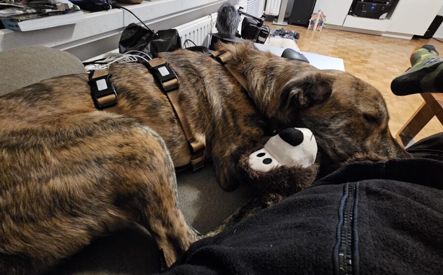 Bei Hundebegegnungen mit fremden Hunden zeigt Tiago noch Stress, doch wenn er einen Hund kennt, spielt er gerne und geht auch Seite an Seite mit ihm spazieren.
