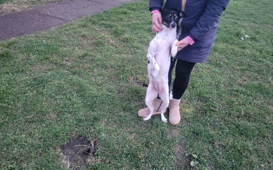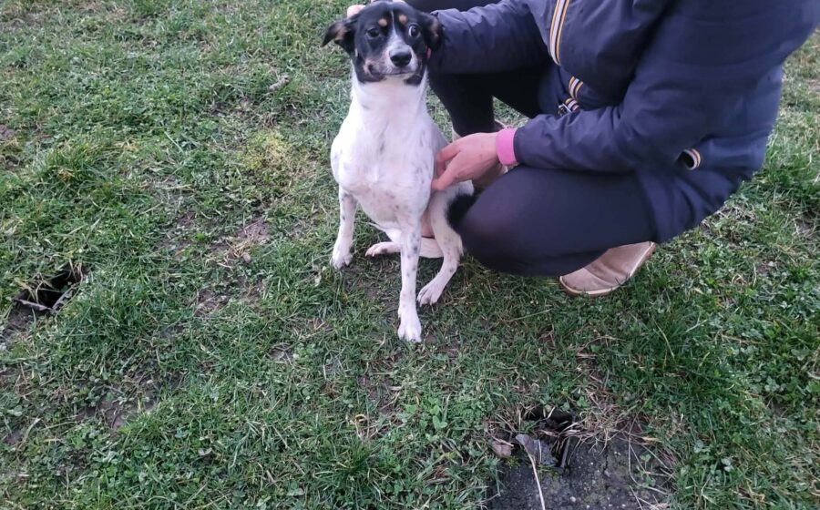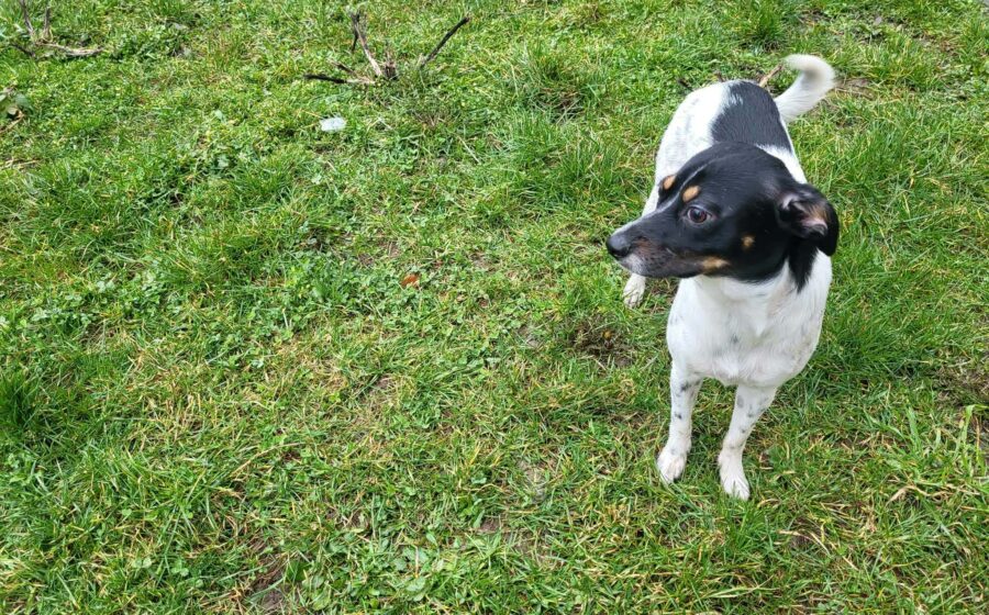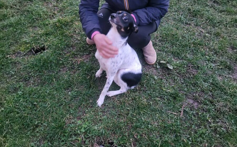 Optisch ist Smilla eine ganz besondere Mischung: überwiegend weißes Fell mit eleganten schwarzen Flecken am Körper und ein ausdrucksstarker Kopf in Schwarz mit warmen braunen Farbtupfern. Eine wirklich einzigartige Erscheinung mit lustigen Flatteröhrchen.