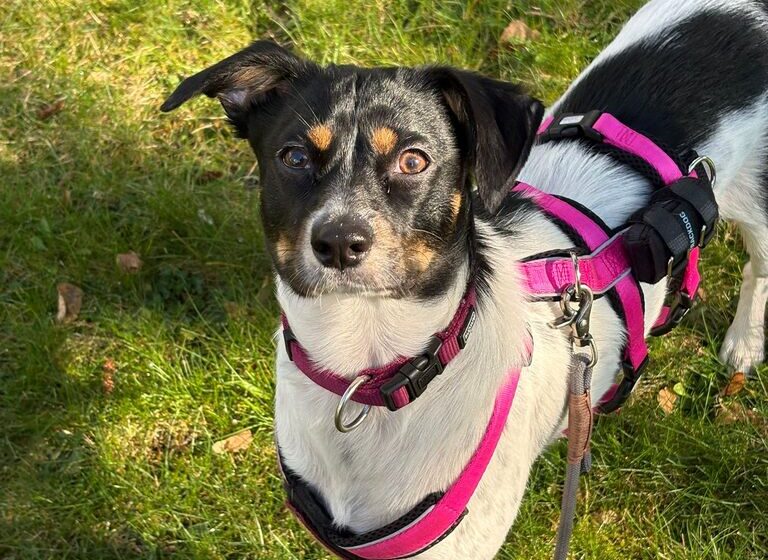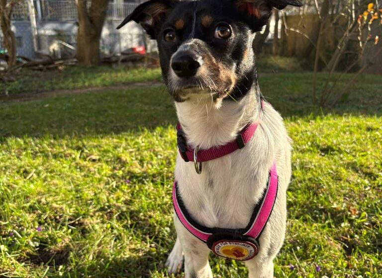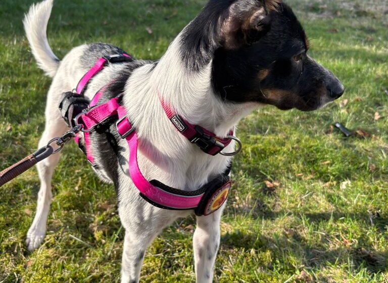 Die etwa 10 Monate alte Hündin ist aktuell ca. 40 cm groß und wird voraussichtlich mittelgroß bleiben. Optisch ist Smilla eine ganz besondere Erscheinung: Ihr überwiegend weißes Fell mit eleganten schwarzen Flecken und ihr ausdrucksstarker Kopf mit warmen braunen Akzenten machen sie zu einem echten Hingucker. Ihre kleinen „Flatteröhrchen“ verleihen ihr zusätzlich einen ganz eigenen Charme.