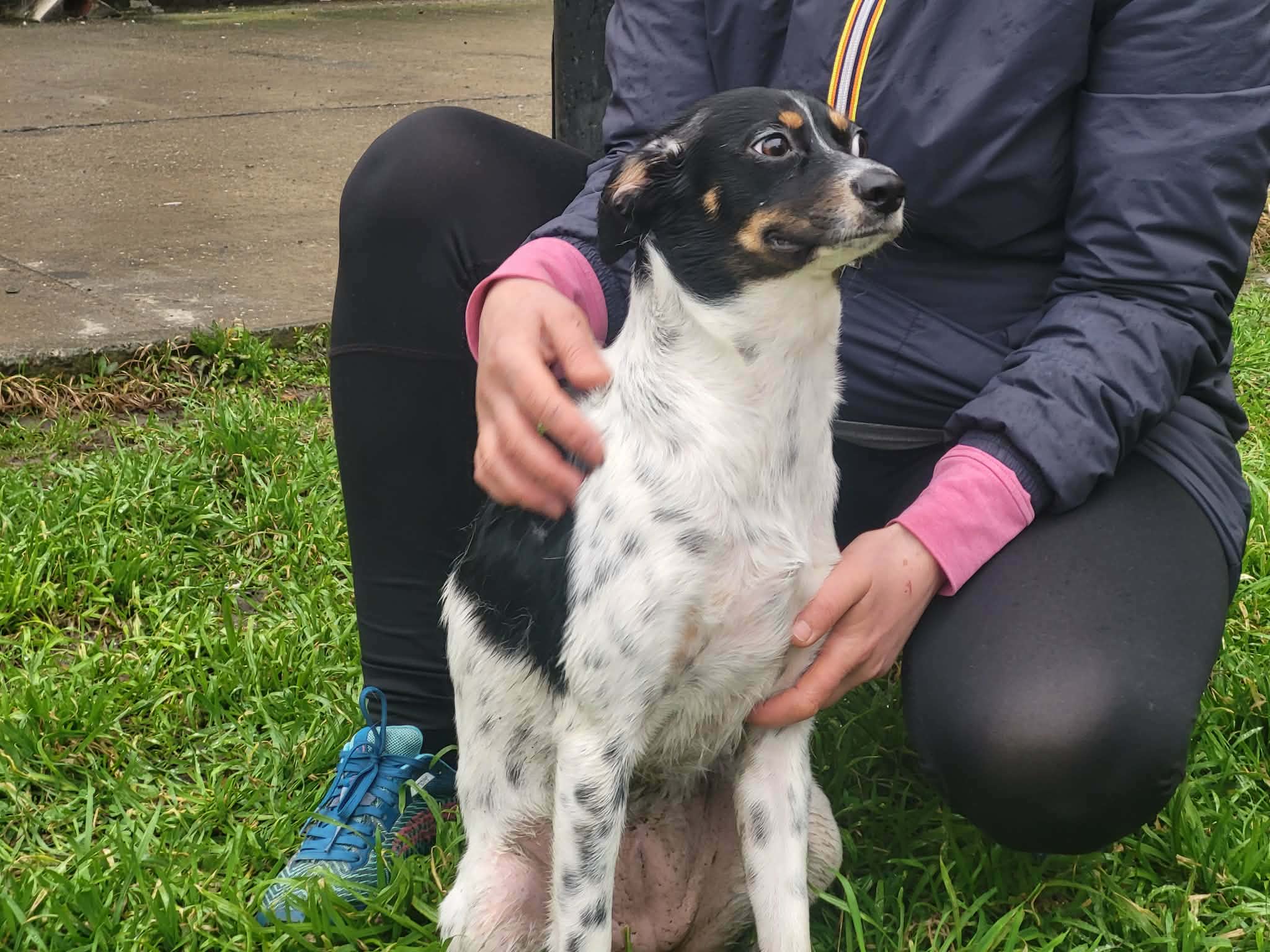 Optisch ist Smilla eine ganz besondere Mischung: überwiegend weißes Fell mit eleganten schwarzen Flecken am Körper und ein ausdrucksstarker Kopf in Schwarz mit warmen braunen Farbtupfern. Eine wirklich einzigartige Erscheinung mit lustigen Flatteröhrchen.