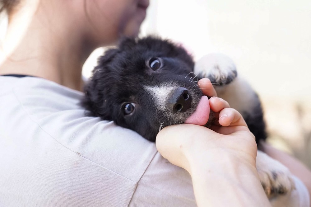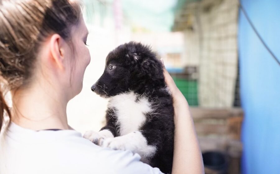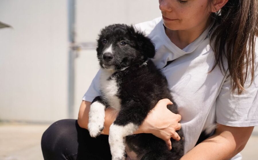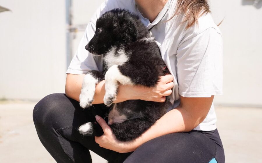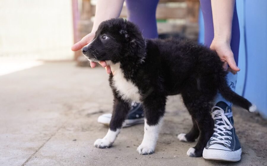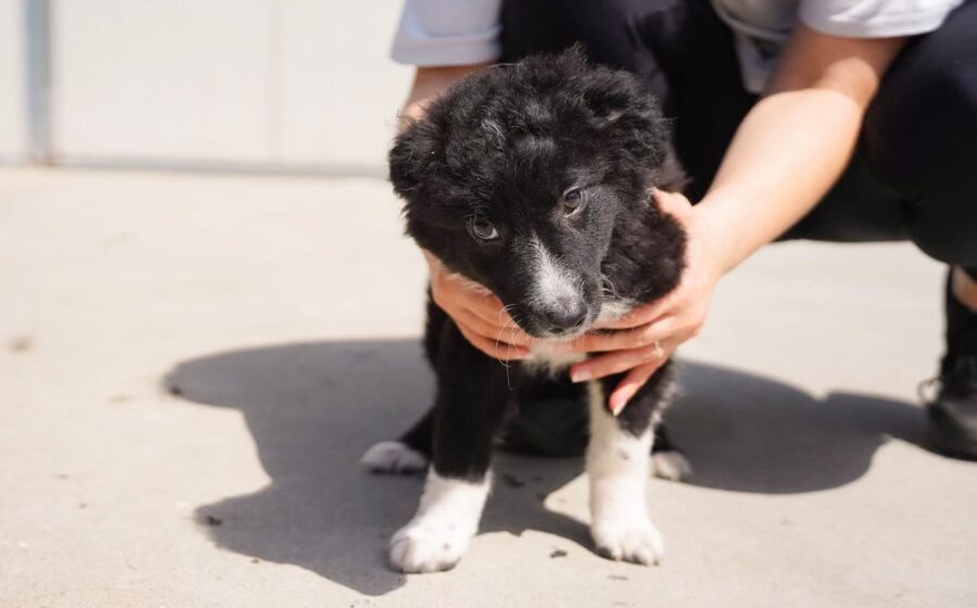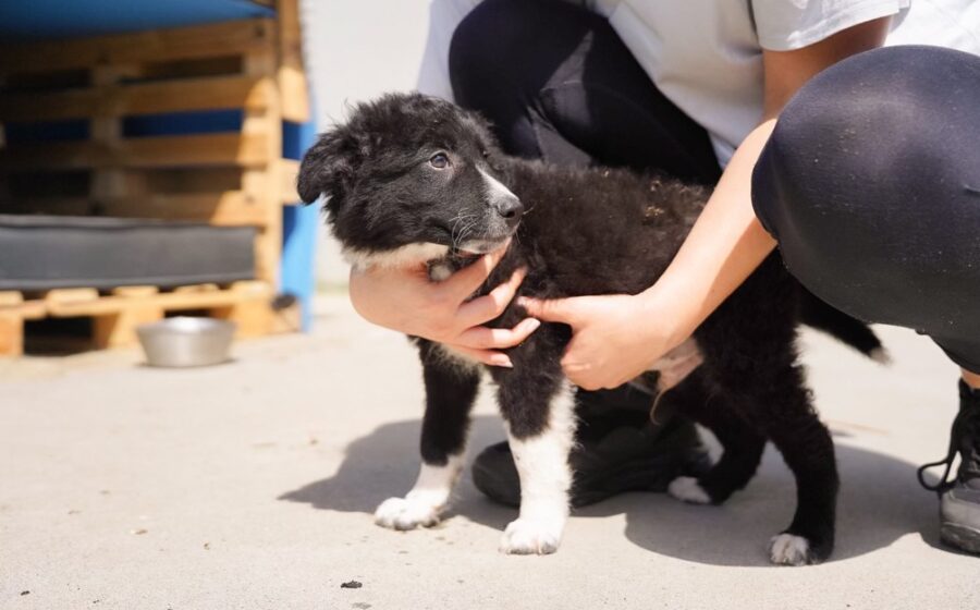 Söckchen ist ein kleiner, etwa 3 Monate alter Hund, der vermutlich einmal eine mittelgroße Größe erreichen wird. Was ihn besonders auszeichnet, sind seine kleinen „weißen Söckchen“ an den Beinchen, die ihm seinen Namen gaben. An seinen Füßchen scheint er tatsächlich weiße Socken zu tragen, und auch an der Schnauze schimmern zarte weiße Akzente. Sein schwarzes, wuscheliges Fell mit dem weißen Lätzchen und der schwarze Schwanz mit der weißen Spitze runden sein niedliches Aussehen ab. Dazu kommen seine warmen, dunkelbraunen Augen, die nur so vor Neugier und Vertrauen strahlen. Jeder, der in Söckchens Gesicht blickt, sieht sofort seine Herzensgüte.