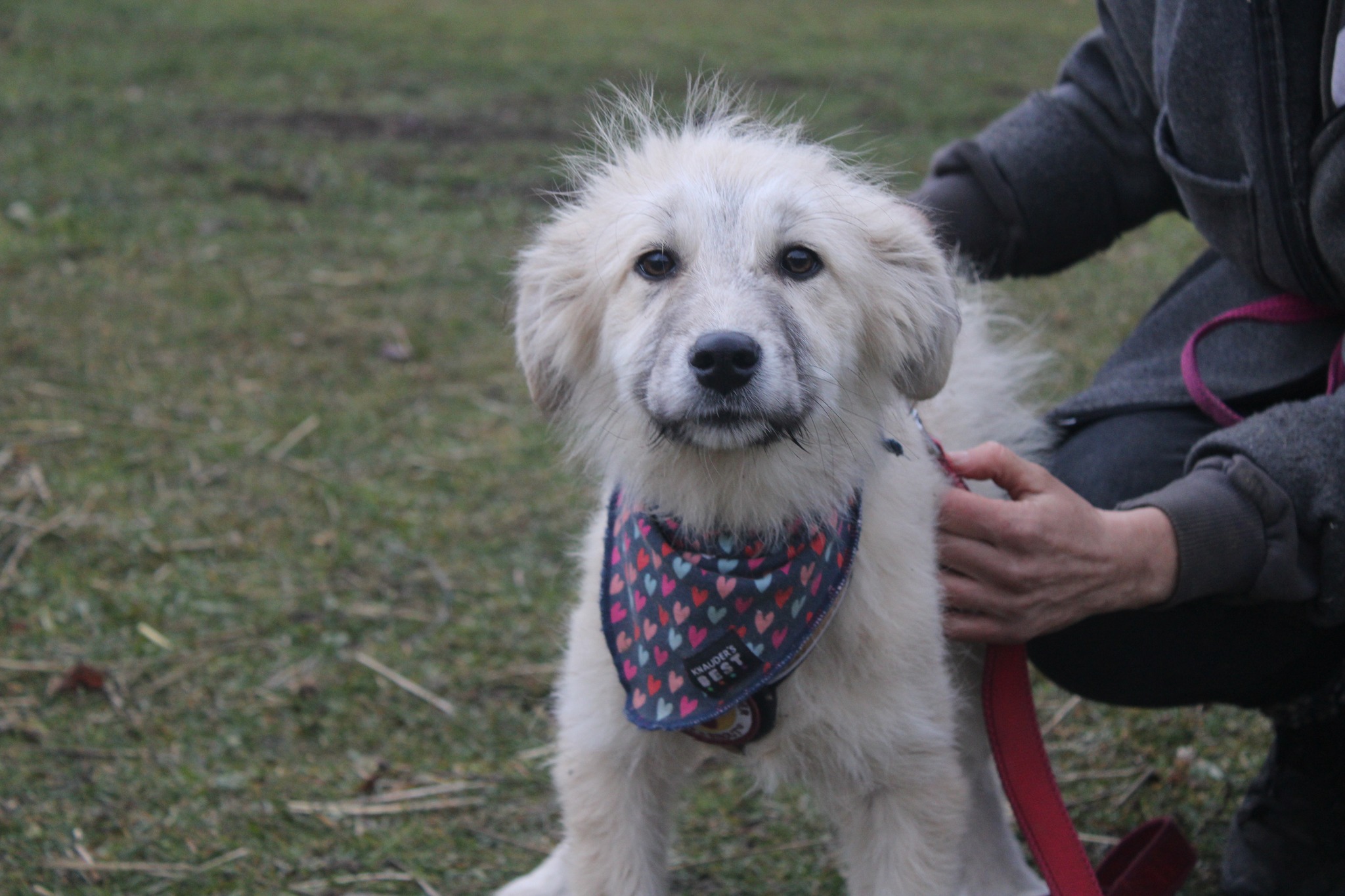 Strubbeline ist ein zartes Mädchen mit hellstrubbeligem Fell, Klappohren und diesen haselnussbraunen Knopfaugen, die sofort das Herz erwärmen. Wer einmal in diese Augen schaut, merkt: Hier kommt ein besonderer Junghund voller Charme und Neugier.