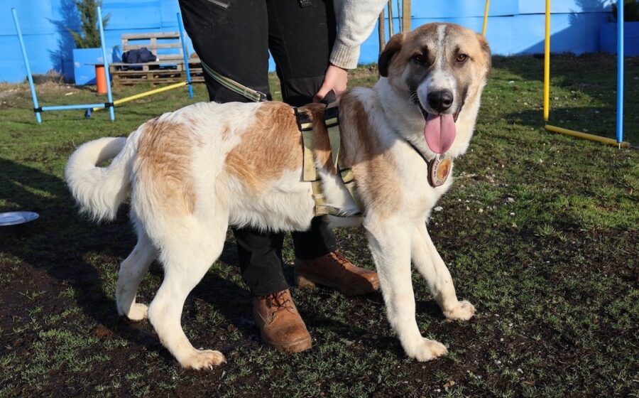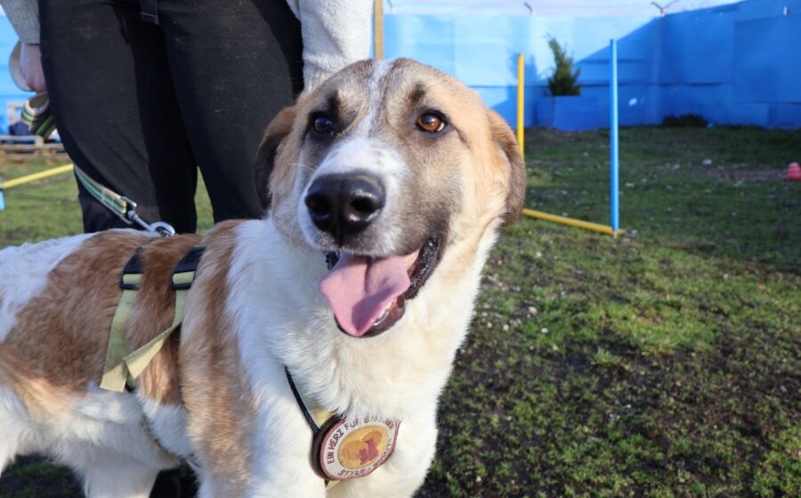 Heute ist Sullivan etwa 1 Jahr alt und misst ca. 50–55 cm Schulterhöhe. Körperlich hat er sich toll entwickelt: Seine Hautprobleme sind vollständig abgeheilt, sein Fell ist nachgewachsen und er hat deutlich an Substanz gewonnen. Aus dem einst kränklich wirkenden Junghund ist ein hübscher, weiß-braun gefleckter Rüde geworden.