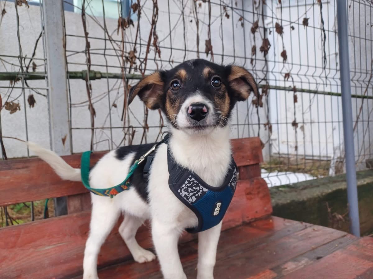 Sein flauschiges Fell in Weiß mit teilweise schwarzem Rücken und die noch etwas zu groß wirkenden Knickohren machen Tacci zu einem Charmeur der Extraklasse. Seine „ich schau dir in die Augen, Kleines“-Technik ist bereits perfekt und wird durch seine Superhelden-Gesichtsmaske komplettiert. Dunkle, glänzende Augen und zwei entzückende rosafarbene Hingucker auf seiner Nase machen ihn einfach unwiderstehlich. Ausgewachsen wird Tacci vermutlich mittelgroß werden. Seine Mama Chara ist ca. 42 cm hoch, aber wir denken, dass ihre Sprösslinge sie überholen werden. Tacci ist ein typischer Welpe – immer auf Entdeckungstour und offen für Abenteuer. Er ist hier gut verträglich mit anderen Hunden, wurde bisher jedoch noch nicht mit Katzen bekannt gemacht.