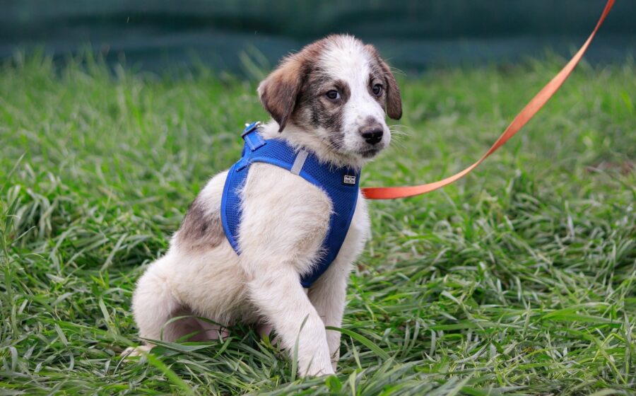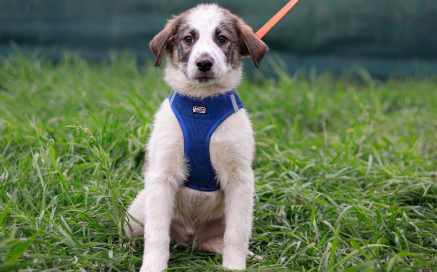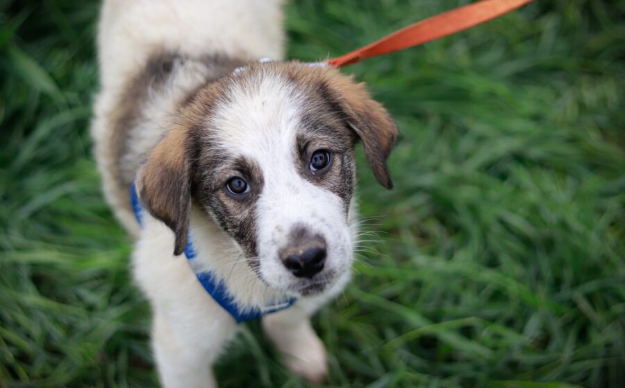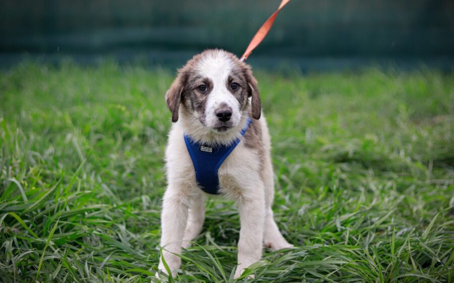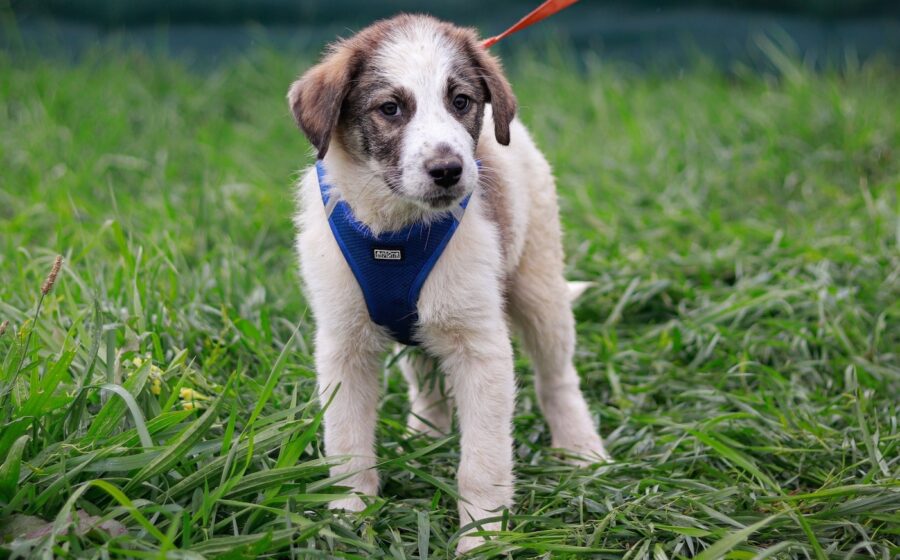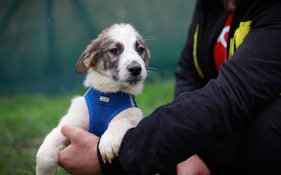 Tagon ist etwa zwei bis drei Monate jung – ein entzückender Welpe mit flauschigem, weißem Fell und einer wunderschönen Gesichtszeichnung, das hauptsächlich aus Weiß mit großen, hellbraun-grauen Flecken besteht. Sein Gesicht wird von einer weißen Blesse zwischen den dunklen, aufmerksamen Augen geziert. Ausgewachsen wird er vermutlich mittelgroß bis groß. Vielleicht schlummert in ihm ein Herdenschutzhund-Mix