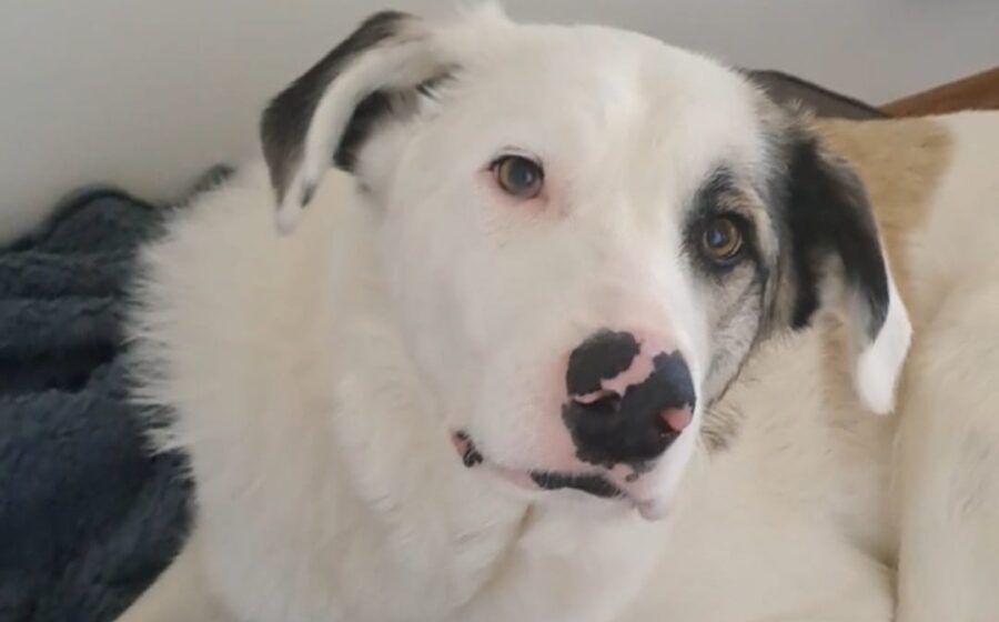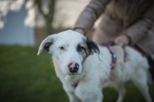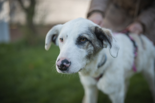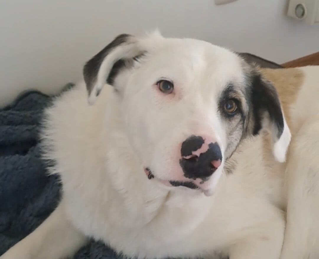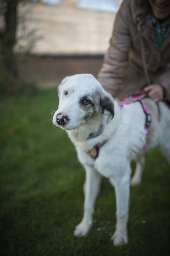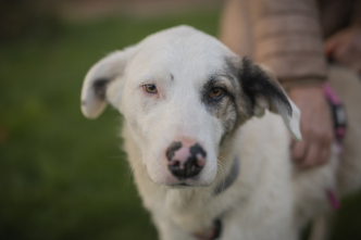 Tapio besticht besonders durch seine Optik. Er ist ein wunderschöner Jungrüde mit einer süßen Sprenkelnase, grünbraunen wachen Augen und einem wunderschönen weißen Fell mit graubraunen Flecken. Nicht zu vergessen: seine süßen Knickohren!