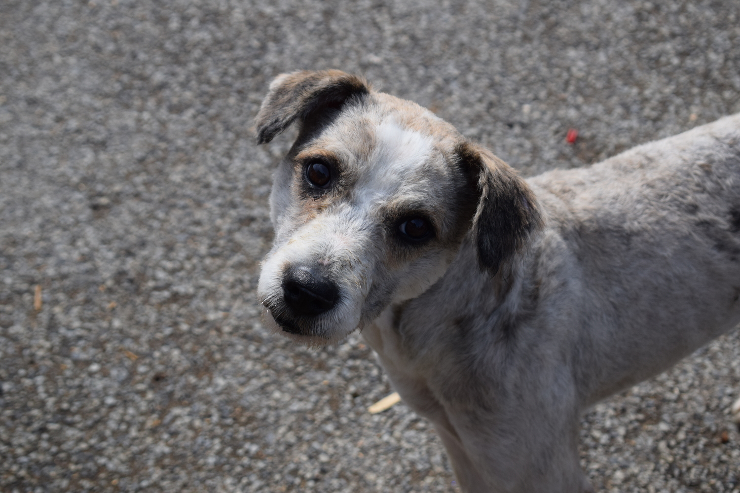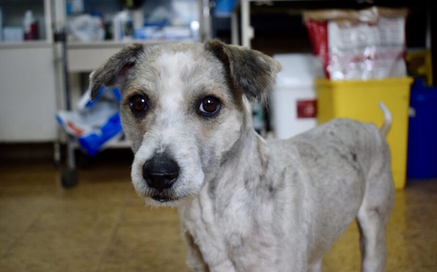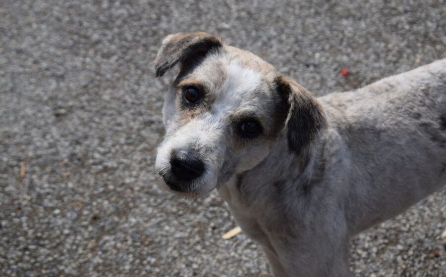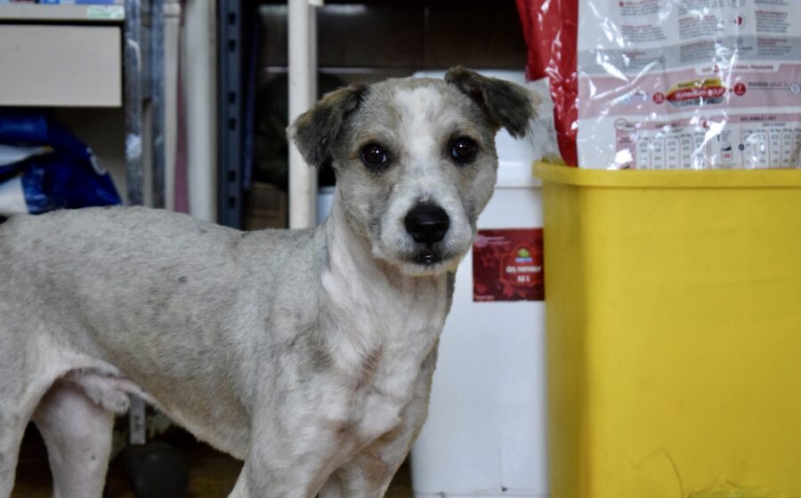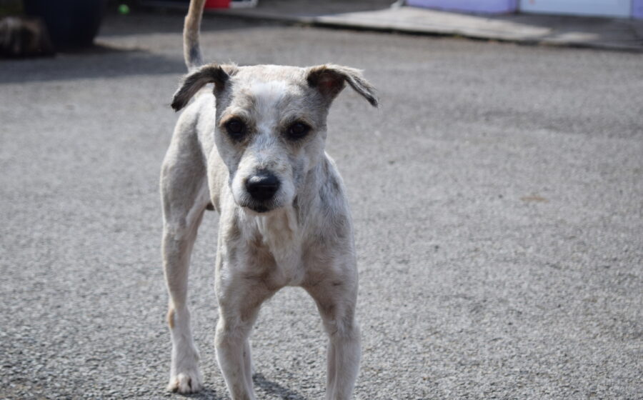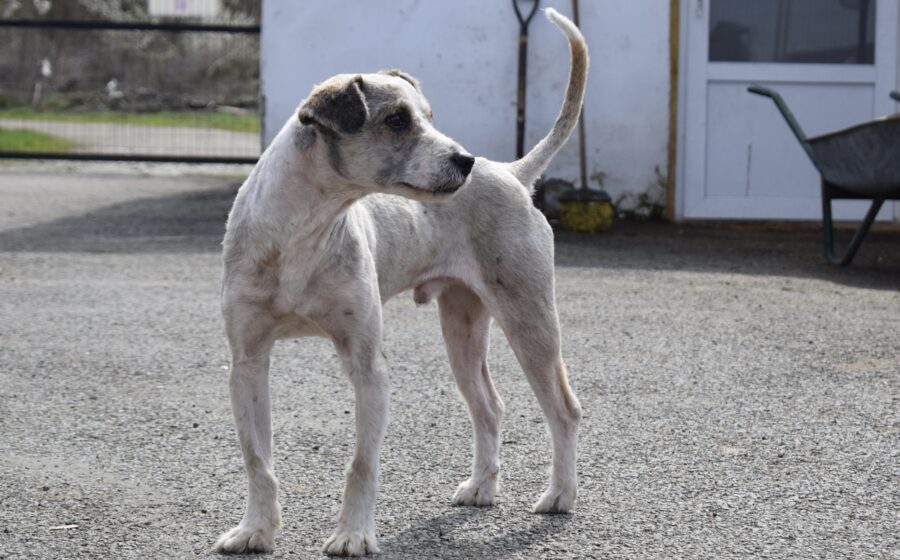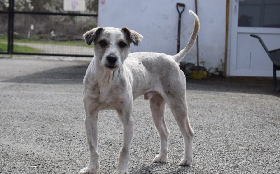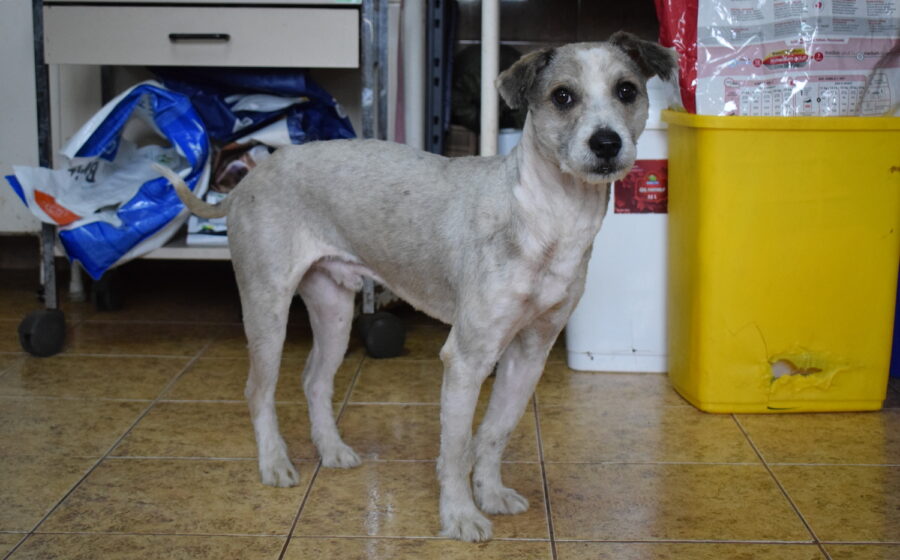 Tibor ist ein etwa 3 Jahre alter Rüde mit einer Schulterhöhe von ca. 40 bis 45 cm und einem Gewicht von rund 13 kg. Optisch zeigt er sich als zarter, mittelgroßer Mischling mit frisch geschorenem, hellem Fell in Creme- und Beigetönen. Besonders auffällig ist sein sanfter, leicht vorsichtiger Blick aus dunklen Augen, der direkt unter die Haut geht. Seine kleinen, leicht gekippten Ohren und seine schlanke Statur verleihen ihm ein sensibles und zugleich sehr liebenswertes Erscheinungsbild.