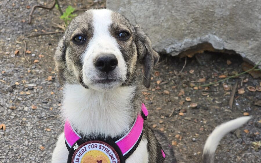 Dürfen wir vorstellen? Das ist Tilda, drei Monate jung und auf der Suche nach ihrem Menschen. Sie ist eine von sieben Geschwistern – Bruni, Möhnchen, Lee, Conny, Fredo und Cobi – die alle den treuen Hundeblick perfektioniert haben. Wie ihre Mama Tiri, eine Schäferhund-Mix-Hündin, sind auch die Welpen wahrscheinlich eine Mischung aus Hütehundrassen. Tilda ist anfangs zwar etwas schüchtern, auf den Fotos aber streckt sie schon keck ihre Nase in die Luft, als wollte sie dort ihre Menschen erschnuppern. Ausgewachsen wird Tilda vermutlich einmal mittelgroß werden. Sie versteht sich gut mit anderen Hunden. Ob das auch für Katzen gilt, wissen wir nicht.