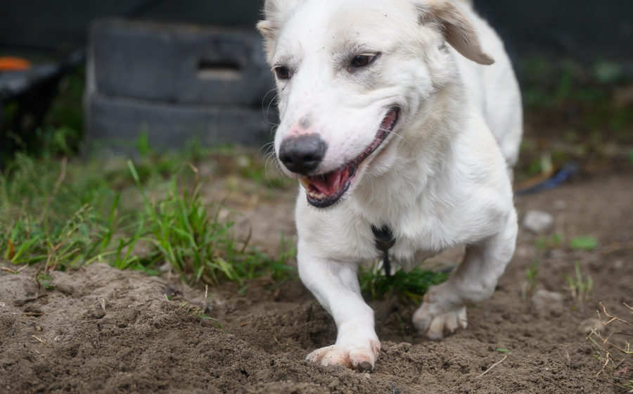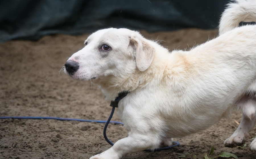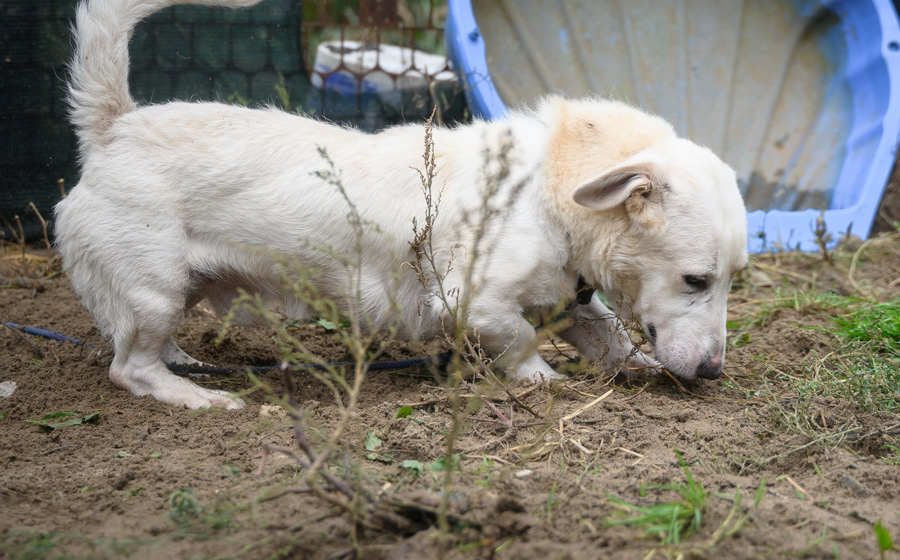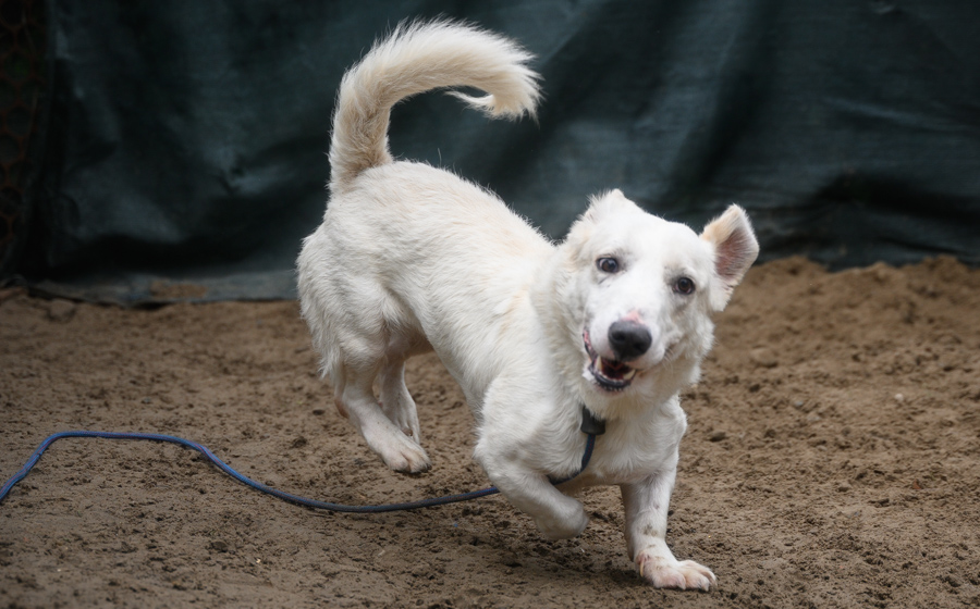 Tuuri akzeptiert inzwischen das Geschirr und die Leine und genießt es sogar, draußen zu sein. Wenn die anderen Hunde hinausdürfen und er nicht, winselt er vor Aufregung, weil er unbedingt mit möchte. Draußen zeigt er eine ganz neue Seite von sich – er ist albern, schnüffelt neugierig, erkundet seine Umgebung und hat sichtlich Freude an seinen kleinen Abenteuern. Er ist kein besonders aktiver Hund, aber manchmal bekommt er seine fröhlichen Momente und rennt ausgelassen herum. Besonders schön zu sehen ist, dass er inzwischen sogar Interesse am Spielen mit den anderen Hunden zeigt – ein großer Schritt für einen Hund, der einst so verschlossen war.