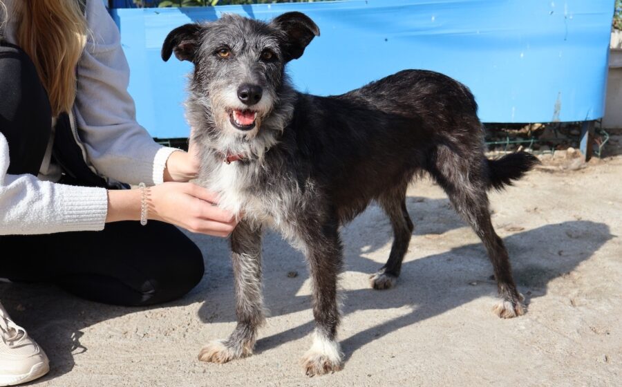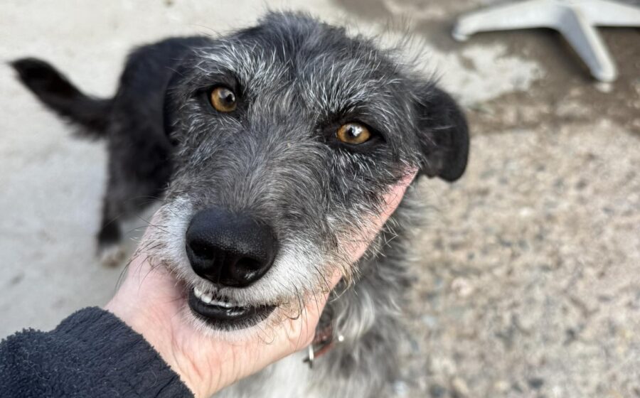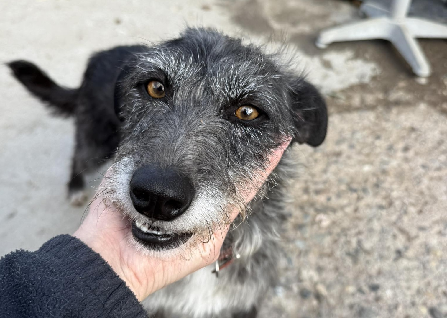 Mit ihren etwa 3 Jahren ist Wanda im besten Alter – voller Energie, Leben und Neugier. Sie ist etwa 40-45 cm groß, also mittelgroß und sportlich gebaut. Ihr überwiegend dunkles Fell wird von feinen weißen Strähnen durchzogen, und ihr weißes Lätzchen und Schnäuzchen verleihen ihr einen einzigartigen, charmanten Look. Ihre lackschwarze Nase, die goldbraunen, wachen Augen und das wunderschön wilde Gesicht machen Wanda zu einer echten Persönlichkeit.