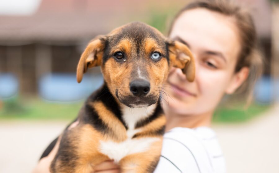 Whitney ist ein besonders hübsches Welpen-Mädchen. Sie hat kurzes, schwarz-braun gezeichnetes Fell und ein dunkles und ein blaues Auge. Sie wird voraussichtlich zu einer beeindruckenden, großen Hündin heranwachsen.