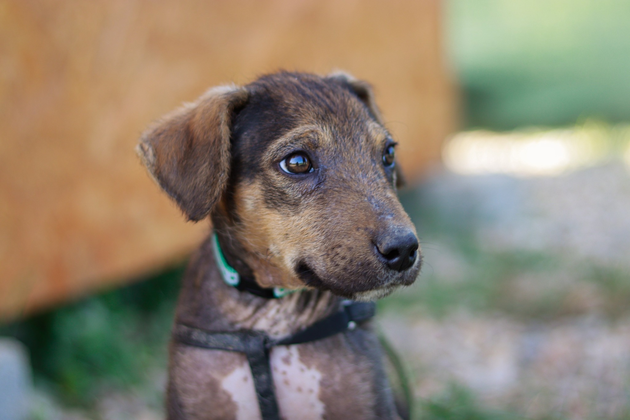 Winni ist ein besonders hübsches Welpen-Mädchen mit kurzem, grau-braun gezeichnetem Fell. Die dreieckigen, kleinen Öhrchen und die schwarzen, feuchten Kulleraugen geben ihr ein lustiges und aufmerksames Aussehen. Sie wird voraussichtlich eine mittlere Größe erreichen und passt so in jede tierliebe Familie.