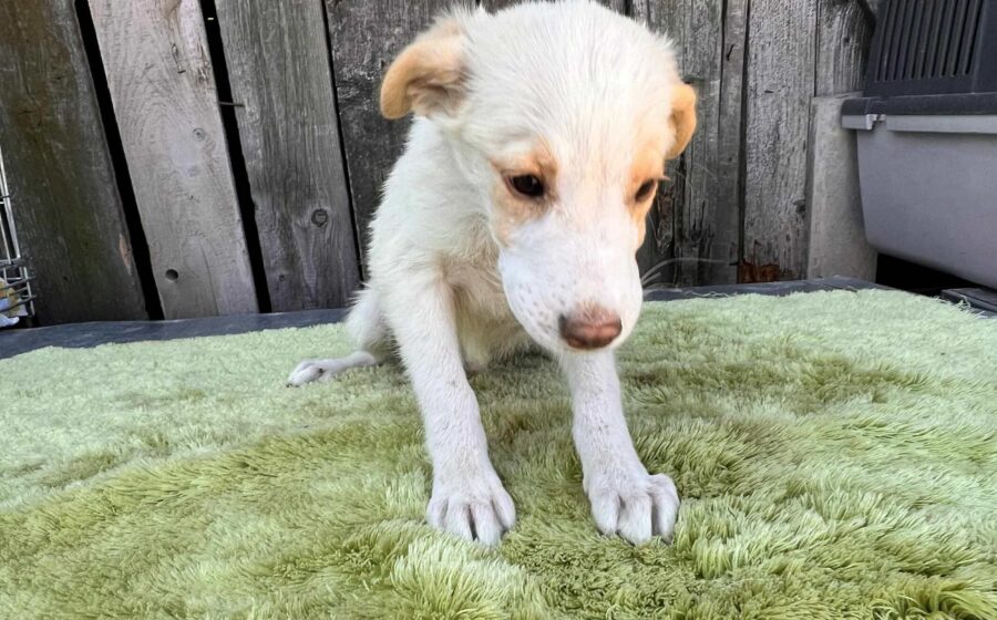 Yuki ist einer dieser Hunde, die man am liebsten direkt auf den Schoß nehmen, in eine Decke wickeln und nie wieder hergeben möchte. Sein flauschiges, cremeweißes Fell, die zarten beigefarbenen Abzeichen um die Augen und Ohren, sein neugierig-sanfter Blick – alles an ihm schreit: Herzhund in spe!